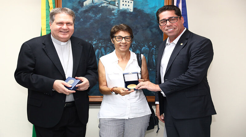 Dom Ângelo Ademir Mezzari, acompanhado pela gerente da Mitra Arquidiocesana de Vitória, Maria da Luz Fernandes, recebeu uma medalha em comemoração aos 190 anos da Assembleia Legislativa. Como boas-vindas, o presidente presenteou o clérigo com uma embalagem café produzido em sua propriedade na região do Caparaó.